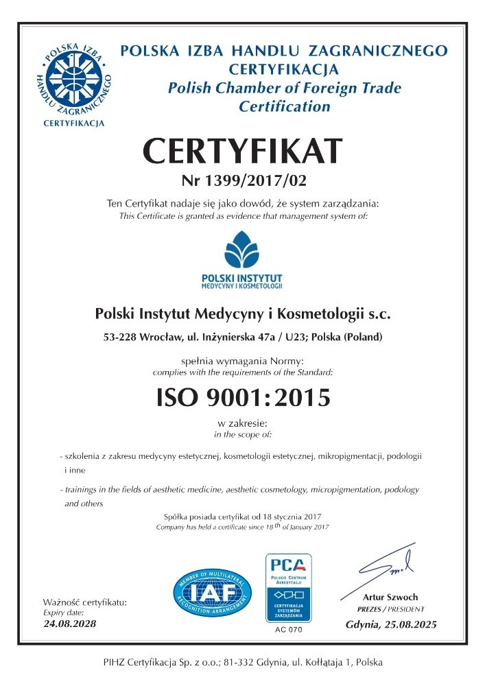 Polski Instytut Medycyny i Kosmetologii S.C prowadzi szkolenia dla lekarzy i lekarzy dentystów z szeroko rozumianej medycyny estetycznej. Naszą misją jest umożliwienie praktykom osiągnięcia pięknych i harmonijnych efektów terapeutycznych, dzięki sprawdzonym, powtarzalnym technikom.